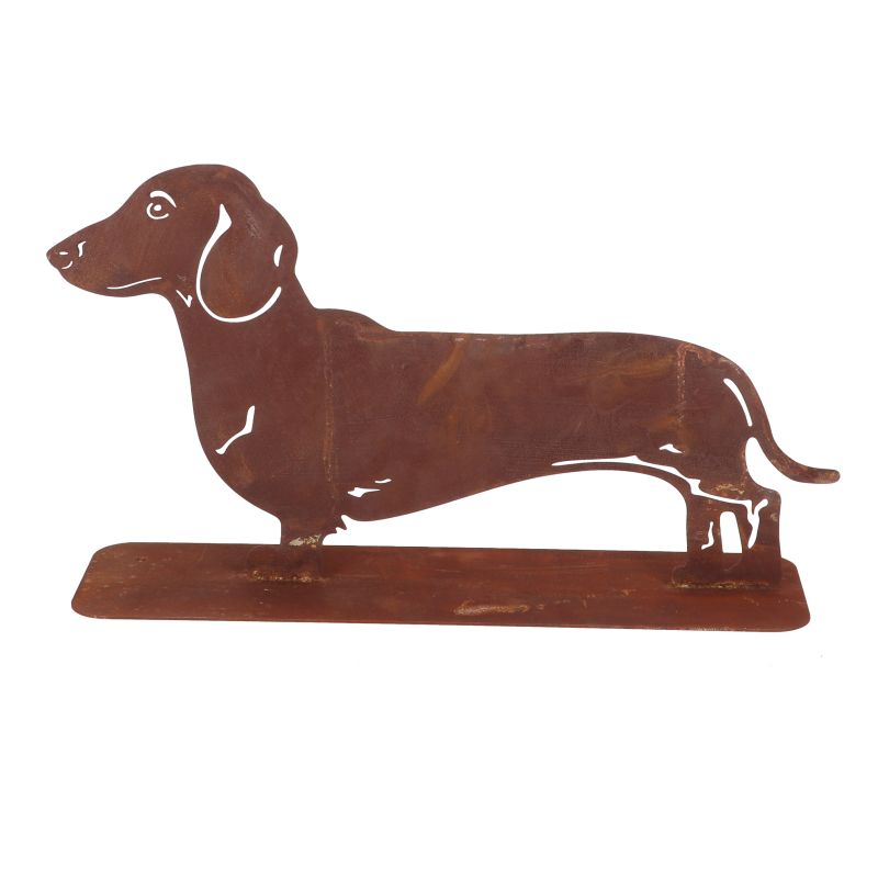 Katze oder Dackel als hübsche, lasergeschnittene Gartendekoration. Die rostige, rustikale Oberfläche entwickelt mit der Zeit eine authentische Patina. Dank der flachen, stabilen Basis lässt sich diese Dekoration überall im Garten einfach platzieren.